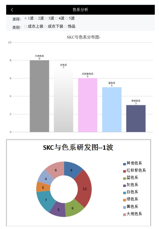 使用说明:客户可以按照波段或品类筛选,来查看自己已订skc数的色系分布,同时下方显示:公司开发skc色系开发图(在相同筛选条件下)。